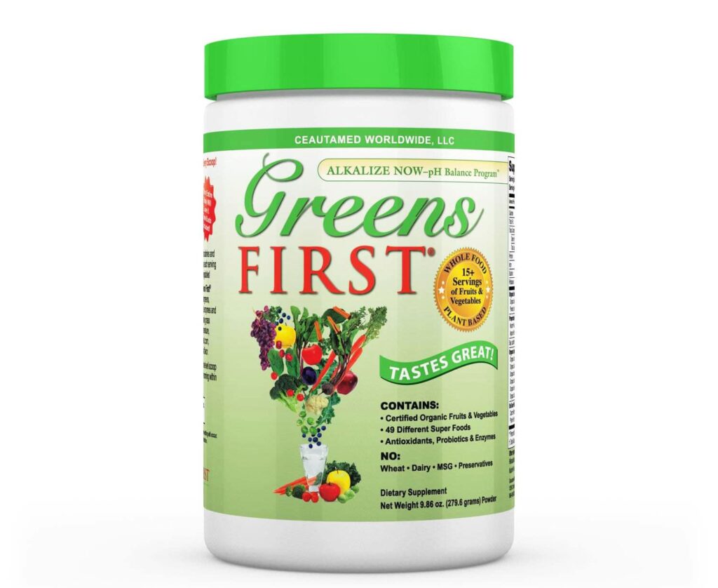 Greens First Original or Berry-contains 15+ servings of fruits and veggies per scoop or try the Greens First Capsules.  Click here to view the Greens First  Powder Ingredients List